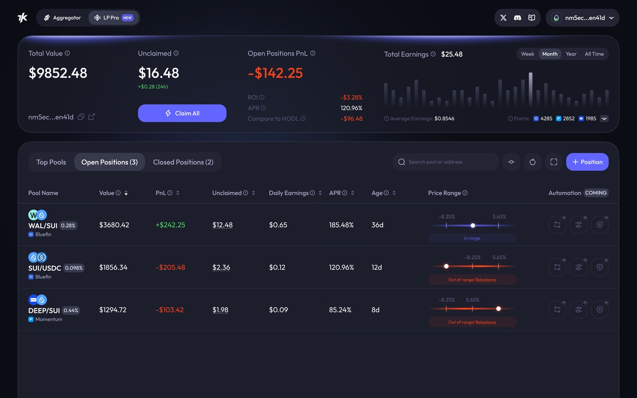 With 7K LP Pro, every major Sui DEX is brought under one roof. No more jumping between interfaces or juggling wallets: users can deposit, track, rebalance, or exit positions across protocols in a single click.