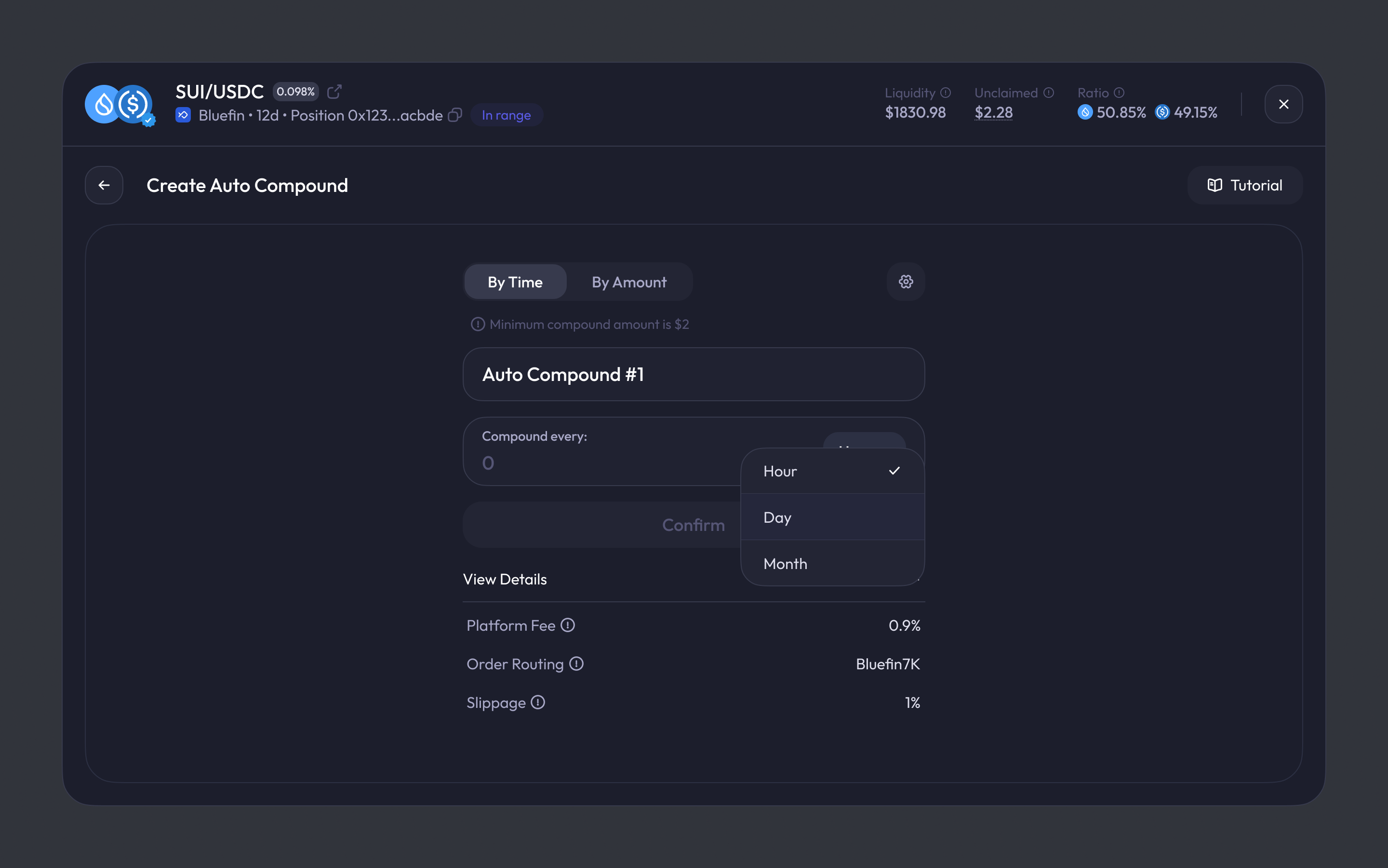 When you enable Auto Compound, the system monitors your liquidity position and executes compounding automatically based on the condition you choose: